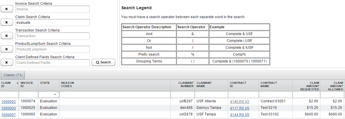 The claim search is a “Full Text” search. Example: If “Evaluate” is entered in the Claim Search Criteria field, then all claims with a status of “Evaluation” will be returned.